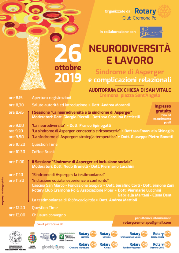 Interverranno anche il Dott. Serafino Corti, direttore del dipartimento delle disabilità della Fondazione Istituto Ospedaliero di Sospiro onlus ed il dott. Simone Zani Presidente dell’Impresa Agricola-Sociale Cascina San Marco di Tidolo. Il convegno, ad ingresso gratuito e sostenuto oltre che dal Rotary Cremona Po anche da otto Rotary Club delle province di Cremona e Brescia, ha ricevuto il patrocinio dell’Ordine provinciale dei Medici Chirurghi e Odontoiatri di Cremona, dell’ASST di Cremona, dell’Amministrazione Comunale di Cremona e della Fondazione Istituto Ospedaliero di Sospiro, ed è rivolto all’intera comunità: l’obiettivo è far conoscere la sindrome di Asperger ed le opportunità di inclusione sociale tramite il lavoro presenti sul territorio.