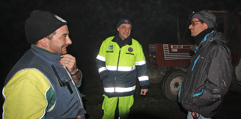 Il morale è comunque alto. La Protezione Civile di Gussola arriva sino a Torricella. Sul confine, persi nel buio e nella nebbia, due uomini stanno coprendo il turno subito dopo la zona ‘del pastore’. Presidiano una delle discese, pronti ad agire. Uno dei due in servizio con la Protezione Civile di Torricella fa parte della Protezione Civile di Ostiano. Anche qui turni da quattro uomini divisi in due gruppi. Belli Franzini si ferma a chiedere come va, e se c’è bisogno di qualcosa. Nel tragitto (con una nebbia fittissima) il sindaco fa fermare la macchina. “Hanno spostato le transenne!”. Si ferma, scende, le sposta per l’ennesima volta. “Meglio essere tranquilli, anche se poi chi vuole passare passa lo stesso”. Da Torricella si torna indietro, sino a Martignana. Qui le Aquile come sempre hanno montato il presidio. Una sorta di gazebo con un tavolo e delle panche. C’è da bere e da mangiare. Un civile ha portato un pentolone di vin brulee. Quando ci si ferma c’è ancora Maurizio Stradiotti, il comandante, in servizio. “Dicono che ad Isola Pescaroli sia già fermo da un po’. Qui sale molto lentamente, probabilmente ci salviamo”. I turni sono già organizzati anche per i prossimi giorni e sino a quando ve ne sarà la necessità.