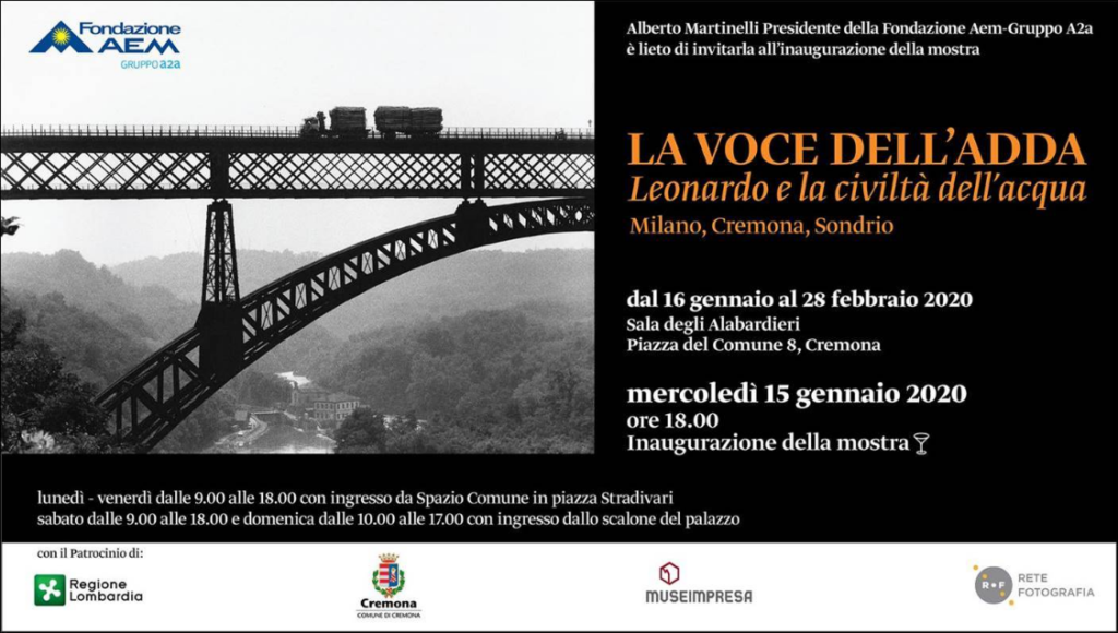 Sbarca a Cremona la mostra “La voce dell’Adda. Leonardo e la civilità dell’acqua. Milano, Cremona, Sondrio”, città molto legata a questo fiume, cui è dedicata l’esposizione a cura di Alberto Martinelli e Fabrizio Trisoglio, visitabile dal 16 gennaio al 28 febbraio, presso la Sala degli Alabardieri del Comune di Cremona. In occasione dell’inaugurazione, mercoledì 15 gennaio alle ore 18, interverranno il Sindaco di Cremona Gianluca Galimberti, l’Assessore ai Sistemi Culturali, Giovani, Politiche della Legalità del Comune di Cremona Luca Burgazzi, il Presidente Fondazione Aem Alberto Martinelli, il fotografo Francesco Radino e il Responsabile Scientifico Fondazione Aem Fabrizio Trisoglio. A seguire si assiste all’importante proiezione dell’inedito documentario “Una città di luce”, realizzato dall’associazione memoMI e dedicato alla storia di AEM e dell’illuminazione di Milano.