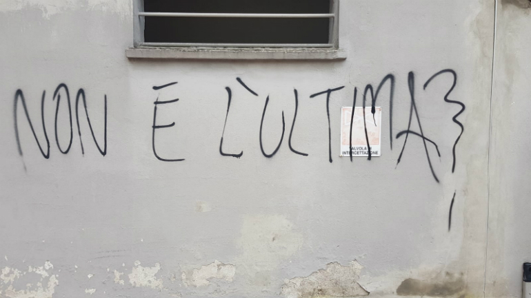 I vandali non si sono limitati a imbrattare i muri esterni, nel portone di ingresso, dove compaiono scritte come “sbirri infami”, “non finisce qui”, “siamo in 100”, “non è l’ultima”. Frasi che sottintendono anche delle minacce, rivolte probabilmente ai residenti dell’abitazione. Anche la stessa porta di casa è stata presa di mira, oltre ai muri perimetrali della villetta, segno che gli imbrattatori hanno scavalcato il cancello per avvicinarsi ulteriormente.