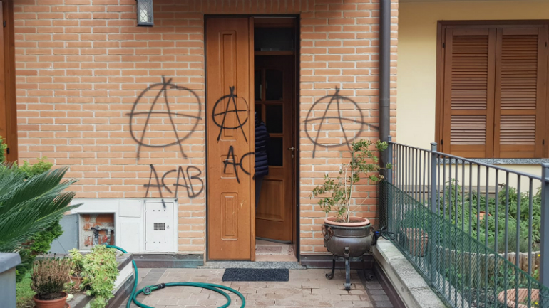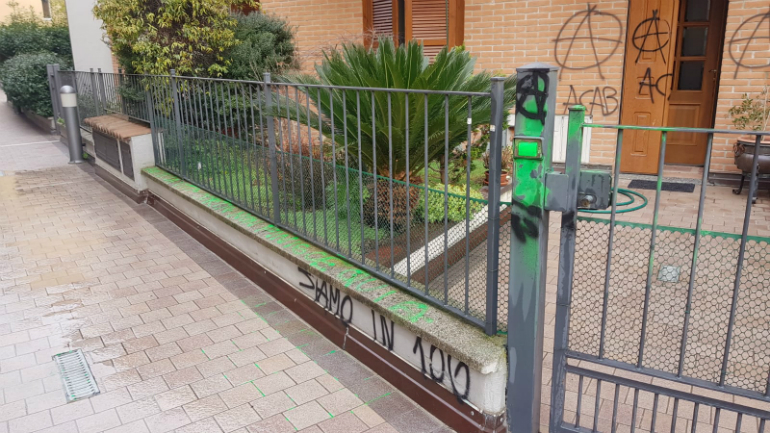I vandali non si sono limitati a imbrattare i muri esterni, nel portone di ingresso, dove compaiono scritte come “sbirri infami”, “non finisce qui”, “siamo in 100”, “non è l’ultima”. Frasi che sottintendono anche delle minacce, rivolte probabilmente ai residenti dell’abitazione. Anche la stessa porta di casa è stata presa di mira, oltre ai muri perimetrali della villetta, segno che gli imbrattatori hanno scavalcato il cancello per avvicinarsi ulteriormente.