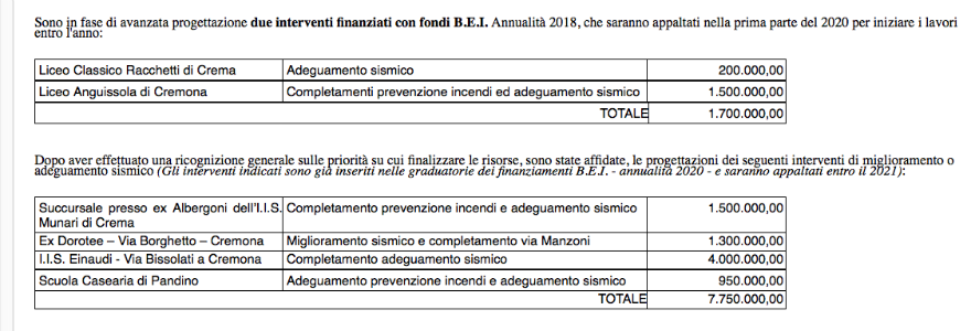 Sono inoltre da poco iniziati o comunque inizieranno entro la primavera altri sei interventi finanziati con fondi della Banca Europea Investimenti (B.E.I.) Annualità 2017, che interessano diversi plessi scolastici e che consentiranno di ristrutturare e riqualificare diversi spazi scolastici o, nel caso di via Manzoni a Cremona, ristrutturare lo stabile per l’utilizzo scolastico; gli interventi sono i seguenti: Sezione Marazzi dell’Istituto Sraffa di Crema: eliminazione vulnerabilità non strutturali ed ampliamento del laboratorio “Moda” per 300.000 euro; Liceo Racchetti di Crema, completamento rifacimento delle coperture con rimozione delle lastre in cemento- amianto, 600.000 euro; Istituto Einaudi ex Dorotee – via Manzoni c Cremona, recupero dell’Aula Magna, 150.000 euro; istituto Einaudi ex Dorotee, ristrutturazione per utilizzo scolastico del fabbricato con adeguamento sismico, 1.800.000 euro; istituto Torriani di Cremona, riqualificazione degli spogliatoi della palestra del Piano Primo, 150.000euro; Torriani di Cremona, riqualificazione degli spogliatoi della palestra del Piano Secondo, 120.000 euro.