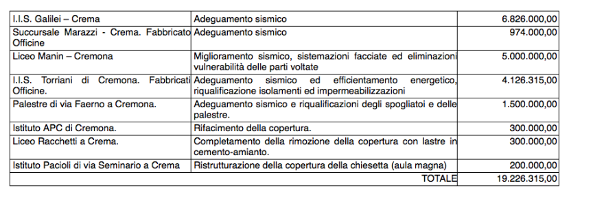 Sono inoltre da poco iniziati o comunque inizieranno entro la primavera altri sei interventi finanziati con fondi della Banca Europea Investimenti (B.E.I.) Annualità 2017, che interessano diversi plessi scolastici e che consentiranno di ristrutturare e riqualificare diversi spazi scolastici o, nel caso di via Manzoni a Cremona, ristrutturare lo stabile per l’utilizzo scolastico; gli interventi sono i seguenti: Sezione Marazzi dell’Istituto Sraffa di Crema: eliminazione vulnerabilità non strutturali ed ampliamento del laboratorio “Moda” per 300.000 euro; Liceo Racchetti di Crema, completamento rifacimento delle coperture con rimozione delle lastre in cemento- amianto, 600.000 euro; Istituto Einaudi ex Dorotee – via Manzoni c Cremona, recupero dell’Aula Magna, 150.000 euro; istituto Einaudi ex Dorotee, ristrutturazione per utilizzo scolastico del fabbricato con adeguamento sismico, 1.800.000 euro; istituto Torriani di Cremona, riqualificazione degli spogliatoi della palestra del Piano Primo, 150.000euro; Torriani di Cremona, riqualificazione degli spogliatoi della palestra del Piano Secondo, 120.000 euro.