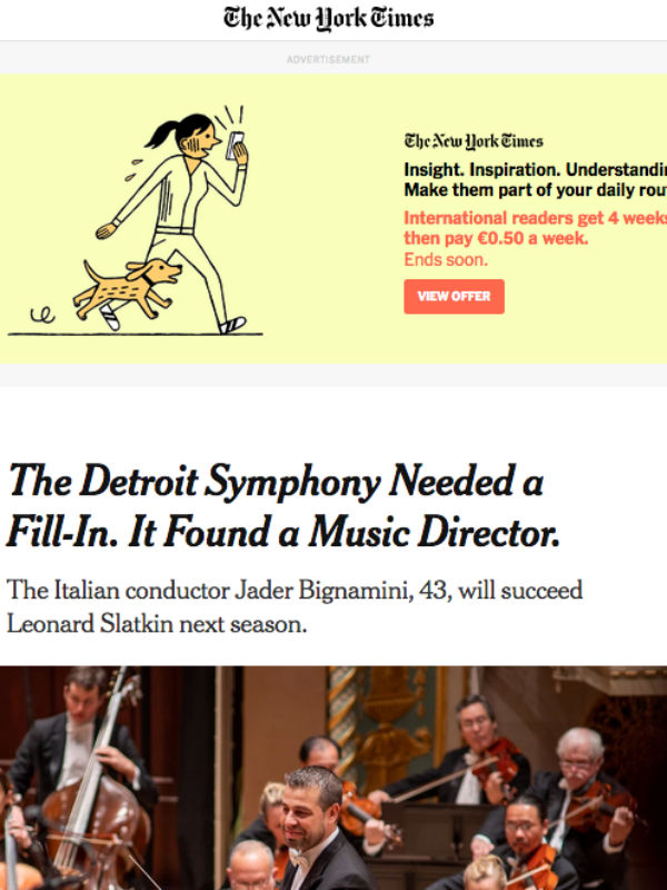 Come spiega anche il New York Times, c’è già feeling tra i membri dell’orchestra e il nuovo direttore che ha dichiarato “è stato un amore a prima vista”. Un privilegio, prosegue, scoprire che a due anni di distanza dalla prima esibizione, “questo legame non è stata che una scintilla di un’inesauribile fonte di ispirazione”. Il maestro Bignamini è stato scelto come direttore musicale della DSO da una delegazione formata da professori dell’orchestra insieme ai membri del CDA e allo staff manageriale. Jader ha mosso i suoi primi passi musicali nella Banda di Ombriano, a soli 9 anni, che poi, crescendo, ha guidato lui stesso prima di approdare a Milano dove è stato direttore associato dell’orchestra sinfonica Verdi. Oltreoceano, la realizzazione di un sogno.