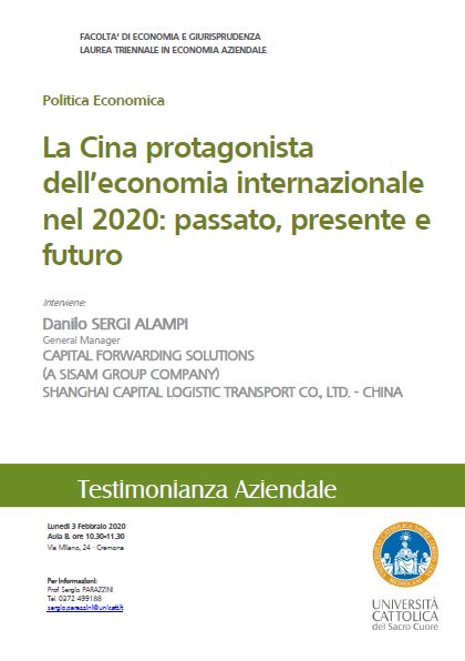 Lunedì 3 febbraio dalle ore 10.30 alle ore 11.30 presso l’aula B dell’Università Cattolica del Sacro Cuore sede di Cremona (via Milano 24), si terrà una Testimonianza Aziendale sul tema ‘La Cina protagonista dell’economia internazionale nel 2020: passato presente e futuro’.