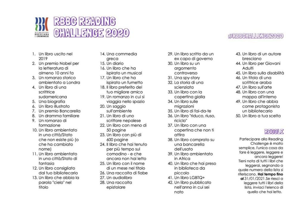 50 libri in un anno. E’ questa la sfida lanciata dalla Rete Bibliotecaria bresciana e cremonese anche per il 2020. Addio quindi a serie tv e uso intensivo dei social, anche se non del tutto: dalla Rete si invita infatti a pubblicare le foto dei libri prescielti utilizzando anche l’hashtag #rbbchallenge2020. Attenzione, però: la scelta dei titoli sarà libera, ma regolata da una serie di vincoli. Dal libro preferito del vostro migliore amico ad un Premio Nobel, con un occhio di riguardo anche per il sociale e l’inclusione: nella lista ci sono infatti titoli su temi come LGBTQ+ e disabilità. Ma anche per allargare i confini geografici degli autori che si vanno a scegliere. Se il Sudamerica si è creato una sua fetta di lettori fidelizzata, sulla lista ci sono anche auotri nepalesi, arabi e…bresciani. Categorie geografiche, ma non solo: tra i titoli da dover “collezionare” anche generi (spy-story, romanzo di formazione, fai-da-te ed altro) e forme diverse (lunghezza, colore e ‘bellezza’ della copertina, ecc). Il termine per completare la lista dei 50 libri è fissato per il 31 gennaio 2021.