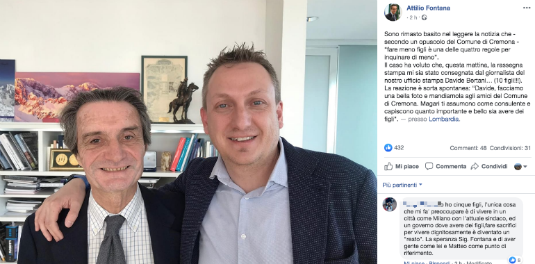 Il caso del libretto sull’emergenza climatica finito per errore sui tavoli di SpazioComune, con i loghi di Filiera Corta Solidale, Comune di Cremona, Cremona Solidale e Fondazione Cariplo, è finito anche all’attenzione del presidente della Regione Lombardia Attilio Fontana. Che in un post su Facebook si è fatto fotografare insieme al giornalista dell’ufficio stampa regionale Daniele Bertani, forte di 10 figli. “Sono rimasto basito – scrive Fondana – nel leggere la notizia che secondo un opuscolo del Comune di Cremona “fare meno figli è una delle quattro regole per inquinare di meno”.