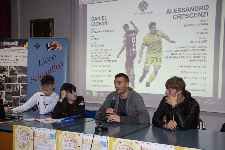 “C’è qualche bullo qui che lo mettiamo in riga?”. Va dritto al punto Daniel Ciofani che insieme al compagno di squadra Alessandro Crescenzi e al direttore sportivo Nereo Bonato hanno incontrato questa mattina, mercoledì 19 febbraio, al Liceo Aselli le otto prime dell’istituto. Temi caldi dell’incontro, infatti, sono stati il bullismo e il razzismo.