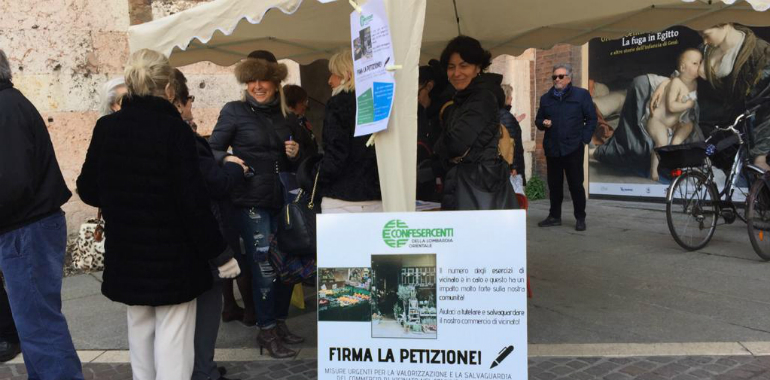 Lunga fila di persone in piazza Stradivati al banchetto di Confesercenti, che sta raccogliendo firme per una petizione rivolta ai titolari di imprese circa le misure urgenti richieste alla pubblica amministrazione per la valorizzazione e la salvaguardia del commercio di vicinato nel comune di Cremona. Un’iniziativa che l’associazione ha avviato a fronte del proliferare di centri commerciali e strutture della media e grande distribuzione nel territorio comunale. Molte dunque le persone che hanno voluto dare il proprio appoggio, per quella che i commercianti considerano una situazione ormai fuori controllo.