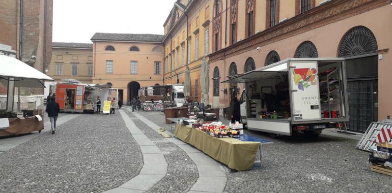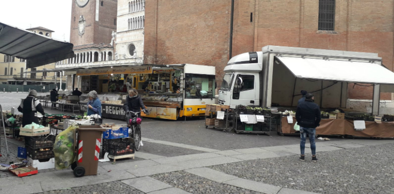 Piazza della Pace vuota, come via Lombardini, via Monteverdi e via Confalonieri. Il mercato del sabato a Cremona stamattina, sabato 29 febbraio, poteva contare su appena una quindicina di banchi invece dei soliti 152. Come da ordinanza, infatti, erano autorizzati unicamente i venditori di alimentari. In zona Duomo esercitavano solo tre banchi (uno di formaggi, uno di formaggi e salumi e uno di dolci e caramelle), come in piazza Stradivari (due di frutta e uno di olive e frutta secca e disidratata). Qualcuno in più, invece,in Largo Boccaccino (due banchi frutta, uno di salumi e uno di miele), mentre la maggior presenza si è registrata in piazza Zaccaria con sei ambulanti (due gastronomie-firggitorie, uno di formaggi e salumi e tre banchi frutta). I banchi hanno mantenuto la stessa collocazione abituale, nonostante gli ampi spazi lasciati dai colleghi cui è stato interdetto l’esercizio dato che per ottenere il cambio di piazzola si sarebbero dovuti mettere in atto alcuni passaggi formali e burocratici che, considerata l’eccezionalità della situazione, avrebbero avuto poco senso. Tra i banchi alimentari fossero aperti anche agenti della Polizia e della Polizia Municipale.
