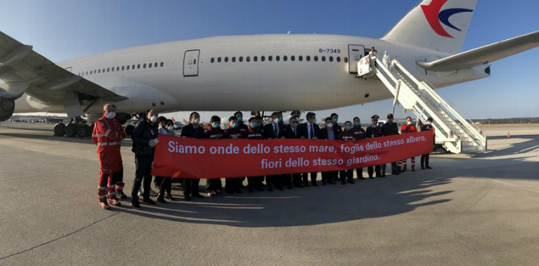 Insieme alle proprie competenze, il personale cinese ha posato con uno striscione di speranza che riportava una frase di Seneca: “Siamo onde dello stesso mare, foglie dello stesso albero, fiori dello stesso giardino”. In arrivo anche tanto materiale tra cui più di 400mila mascherine, 5mila indumenti protettivi medici, guanti, occhiali protettivi, monitor, indumenti protettivi, disinfettanti. Oltre a questo, anche 30 respiratori, di cui 15 invasivi, definiti “di vitale importanza” sia da Sala che dal sottosegretario al rapporto con le delegazioni internazionali Alan Rizzi.