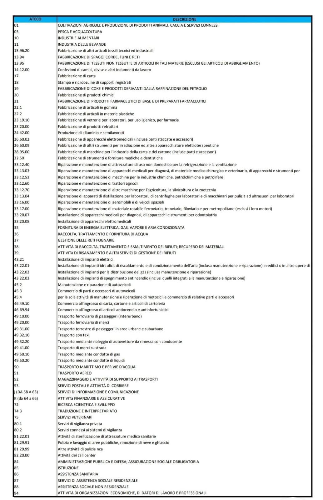 Conte ha chiarito che verrà fornita una lista dettagliata delle attività che rientrano in questa categoria, ma ha già assicurato che supermercati, alimentari, farmacie e parafarmarcie rimaranno aperte senza riduzioni di orario e che pertanto “non c’è ragione di procedere ad una corsa agli acquisti”. Oltre a queste, saranno garantiti anche i trasporti e le attività bancarie, finanziarie, postali e legate ai servizi pubblici, oltre alle attività connesse a quelle ritenute essenziali. Inoltre, potranno tenere aperte le attività che prevedono lavoro in modalità smart working e quelle “produttive ritenute comunque rilevanti per produzione nazionale”. (QUI LA BOZZA CON L’ELENCO DELLE ATTIVITA’ APERTE)