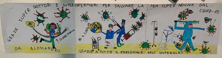 E’ Federica Boschi, ex insegnante di scuola dell’infanzia di 64 anni, la nonna del disegno fatto dal nipotino Alessandr0 e indirizzato ai sanitari dell’ospedale di Cremona che l’hanno avuta in cura, pubblicato sulla pagina Facebook dell’Asst. “Grazie superdottori e superinfermieri per salvare la mia supernonna dal Covid – 19” si legge nel disegno di Alessandro, mostrato dall’equipe medica, una volta tanto sorridente.