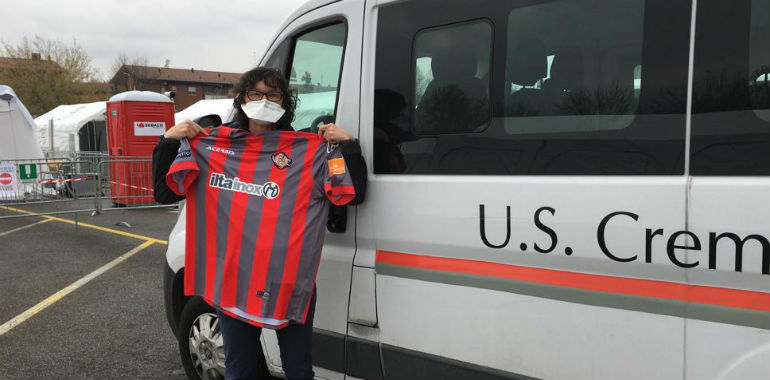 Nella foto, la team leader dei Samaritan’s Purse con la maglia della Cremonese. La società sportiva ha messo a disposizione i mezzi di trasporto per il trasferimento dei sanitari americani da e per l’ospedale da campo, oltre ad essere tra i donatori della raccolta fondi Uniti per la Provincia di Cremona. “Non dimenticherò mai questo posto e mai questi colori”, ha detto
