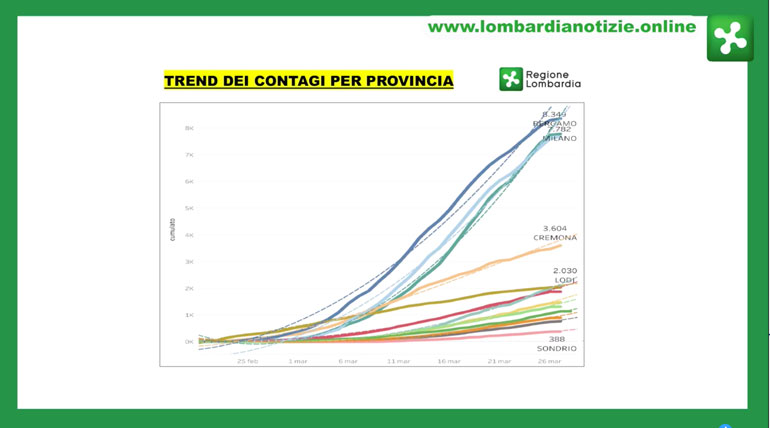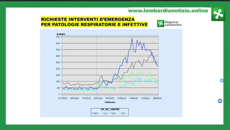 I dati complessivamente disegnano tuttavia un miglioramento, come ha evidenziato Danilo Cereda, coordinatore dell’Unità di crisi della Regione: “Il livello di pressione sui servizi di emergenza urgenza è in calo oggi, sia nell’area di Brescia e Bergamo sia di Milano, mentre rimane costante nella Bassa. L’aumento dei casi è stato inizialmente esponenziale, mentre dopo gli interventi di limitazione della mobilità delle persone inizia a essere più stabile”.