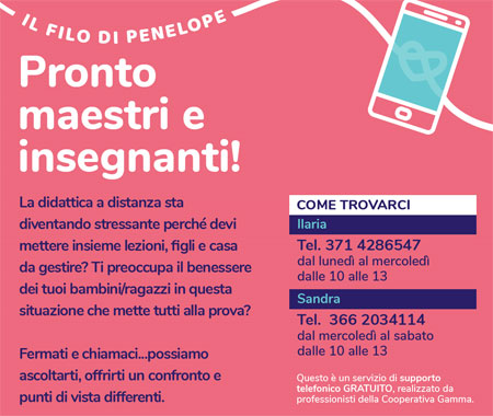 Il filo di Penelope. Si chiama così l’iniziativa lanciata dalla Cooperativa sociale Gruppo Gamma per dare un supporto telefonico a genitori ed insegnanti che si trovano a vivere una situazione di difficoltà in questo periodo di emergenza legata al coronavirus. Una proposta totalmente gratuita che è realizzata da una psicologa e da un’operatrice della cooperativa specializzata in riabilitazione psichiatrica e neuropsichiatria infantile.