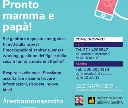 In questo momento, molte mamme e molti papà sono messi a dura prova: si sentono catapultati in un vortice senza tregua tra preoccupazioni sanitarie, smart working, gestione dei figli e della casa e possono trovarsi in affanno. La Cooperativa Gamma si mette in ascolto di questi genitori, dando la disponibilità insieme a trovare informazioni, risposte, nuove idee per affrontare al meglio le difficoltà.