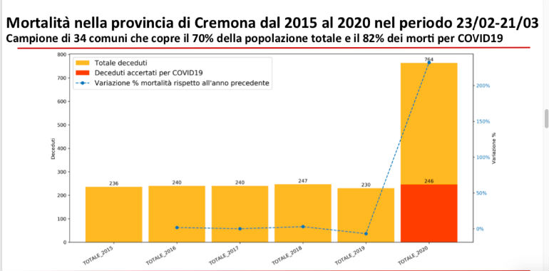 Per Cremona, è stato preso un campione di 34 comuni, che copre il 70% della popolazione totale e l’82% dei morti per COVID19. Se negli anni dal 2015 al 1019 i morti sono stati mediamente 240, con piccolissime oscillazioni, nel 2020 il totale è salito a 764, di cui solo 246 accettati Covid. Tra il 2019 (230 morti) e il 2020 c’è una differenza di 534 persone ufficialmente decedute per cause non imputabili al virus, con un balzo percentuale rispetto agli anni precedenti del 232%. Una differenza troppo vistosa, da far pensare che il conteggio ufficiale dei morti per Covid sia molto sottostimato rispetto alla realtà.
