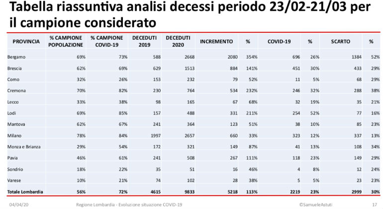 E’ una forte divergenza tra dati ufficiali sui morti da Coronavirus e la realtà che purtroppo ogni giorno rileva chi perde un proprio caro, ciò che emerge dal focus realizzato da Samuele Astuti, consigliere regionale del Pd e professore a contratto dell’università Liuc di Castellanza (Varese), realizzata in collaborazione con Massimo Cavallin sulla base dei dati della Regione Lombardia e resi disponibili da ISTAT sulla mortalità nei comuni lombardi nel periodo dal 23 febbraio al 21 marzo 2020 per gli anni che vanno dal 2015 al 2020.