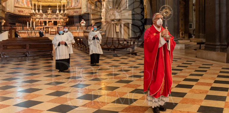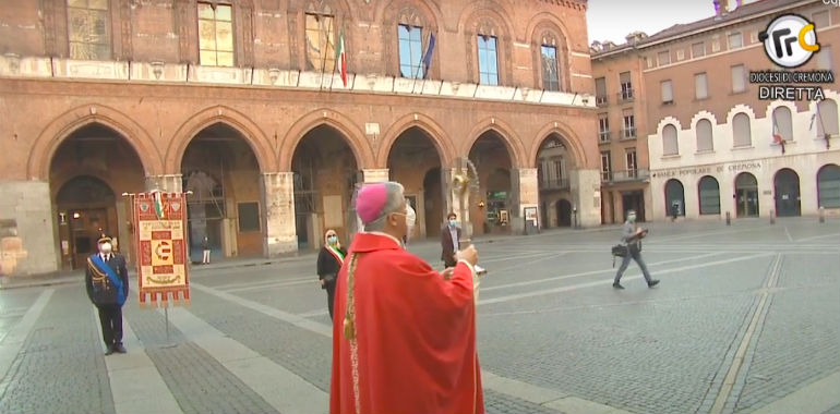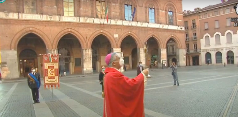 Si è conclusa in modo del tutto particolare l’azione liturgica della Passione del Signore che il vescovo Antonio Napolioni ha presieduto nel pomeriggio di venerdì 10 aprile in Cattedrale. Non potendosi svolgere in serata la tradizionale processione cittadina del Venerdì Santo, monsignor Napolioni ha voluto comunque portare in qualche modo per le strade di Cremona quella che la tradizione vuole essere un frammento della corona di spine posta sul capo di Gesù e donata , subito dopo l’elezione al Soglio di Pietro, da Gregorio XIV (Niccolò Sfondrati) alla città della quale era stato vescovo per 30 anni, dal 1560. E proprio con quella Sacra Spina il Vescovo dalla piazza del Comune ha impartito la solenne benedizione alla città e alla diocesi.