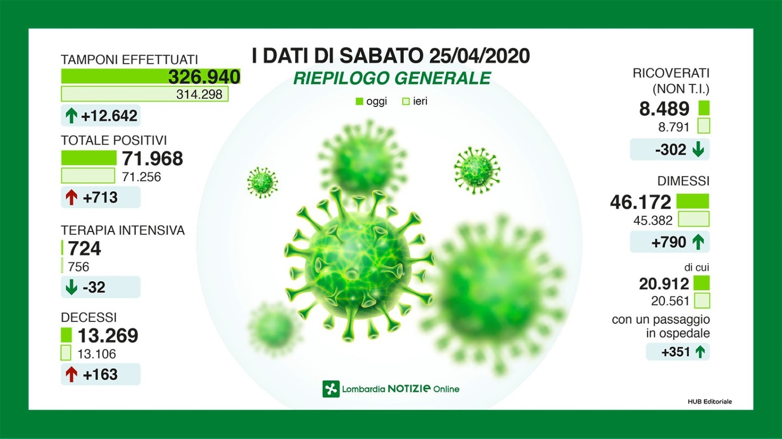 Sono aumentati di 39 unità i casi di positività al Covid in provincia di Cremona, oggi 25 aprile, passando quindi complessivamente da 5.867 a 5.906. Crescono anche tutti gli altri capoluoghi, in particolare Milano, con 219 casi in più. I tamponi effettuati sono stati ben 12.642, per un totale di 71.968 positivi in provincia. Calano ancora i ricoveri in terapia intensiva (-32 rispetto al giorno precedente, ora sono 724), mentre salgono i decessi: +163, per un totale in regione di 13.269.