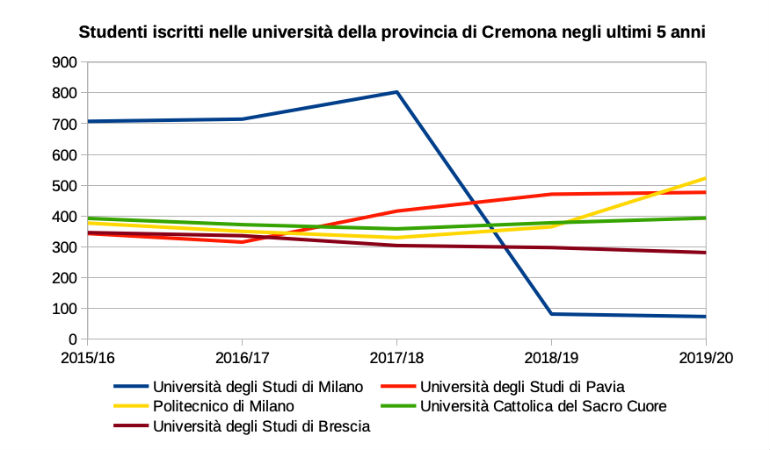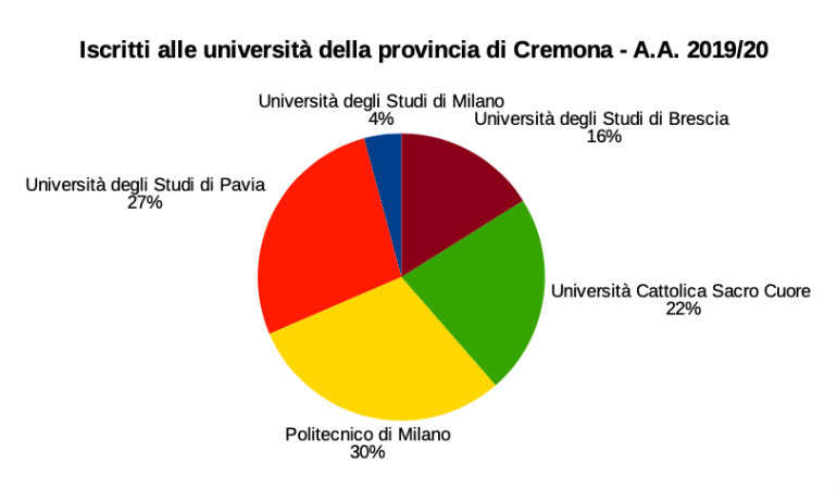 Nell’anno accademico 2019/20, le Università presenti in provincia di Cremona sono cinque, con i seguenti corsi di studi: Politecnico di Milano, corsi di laurea in ingegneria informatica, ingegneria gestionale e in Music and acoustic engineering: l’aumento delle iscrizioni al Politecnico di Milano è dovuto soprattutto alla crescita degli iscritti al corso di “Music and acoustic engineering” (+93); Università Cattolica del Sacro Cuore, corsi di laurea in scienze e tecnologie alimentari e in economia aziendale; Università degli Studi di Pavia, corsi di laurea in musicologia, scienze letterarie e beni culturali; Università degli Studi di Brescia, corsi di laurea in infermieristica, assistenza sanitaria e fisioterapia; Università degli Studi di Milano (sede di Crema) corsi di laurea in infermieristica.