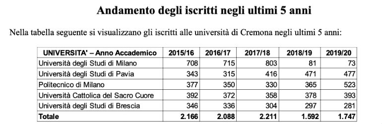 La Provincia di Cremona ha redatto il rapporto sugli studenti iscritti nell’anno accademico 2019/20 e laureati nel 2019 nelle Università che hanno sede in provincia. “Sono dati che mostrano un importante trend in crescita delle iscrizioni nelle realtà universitarie, che sono le nostre eccellenze al servizio del sapere, dell’economia, della società, traghettando le comunità locali lungo la via del progresso grazie a ricerche e studi applicabili in vari ambiti anche produttivi e dando ai nostri giovani una opportunità differente di crescita e di inserimento nel mercato del lavoro” – afferma il presidente della provincia Paolo Mirko Signoroni.