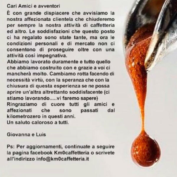 A sorpresa chiude la caffetteria Km0: pesano 3 mesi di chiusura e le incertezze sul futuro