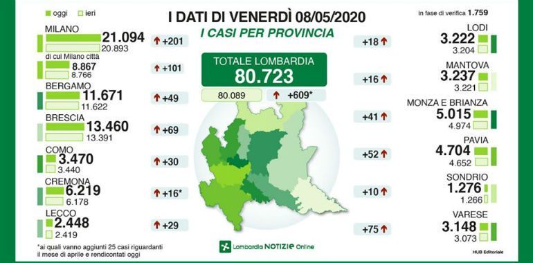 Sono aumentati di altri 16 i casi Covid positivi in provincia di Cremona, mentre le nuove vittime sono 6 (per un totale di 1.044). Questo il dato aggiornato ad oggi pomeriggio della Regione, che porta il numero di contagiati complessivo nella nostra provincia a 6.219. A questi vanno aggiunti altri 25 casi di positività riguardanti il mese di aprile e rendicontati solo oggi. In generale, il contagio cresce ancora in tutte le province lombarde con in testa Milano (+201), Brescia (+69), Varese (+75), Pavia (+52). Complessivamente in Regione sono 80.723 i contagiati, + 609 rispetto ieri.