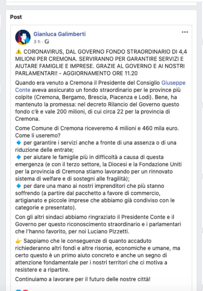 Verranno utilizzati per il sostegno alle famiglie più in difficoltà e per dare una mano all’imprenditoria locali le risorse aggiuntive assegnate dal Governo Conte al Comune di Cremona (4 milioni e 460mila euro), parte dello stanziamento straordinario di 200 milioni richiesto dalle 5 province maggiormente colpite, fin da inizio febbraio, dall’epidemia. Lo spiega il sindaco Galimberti in un post su Facebook: