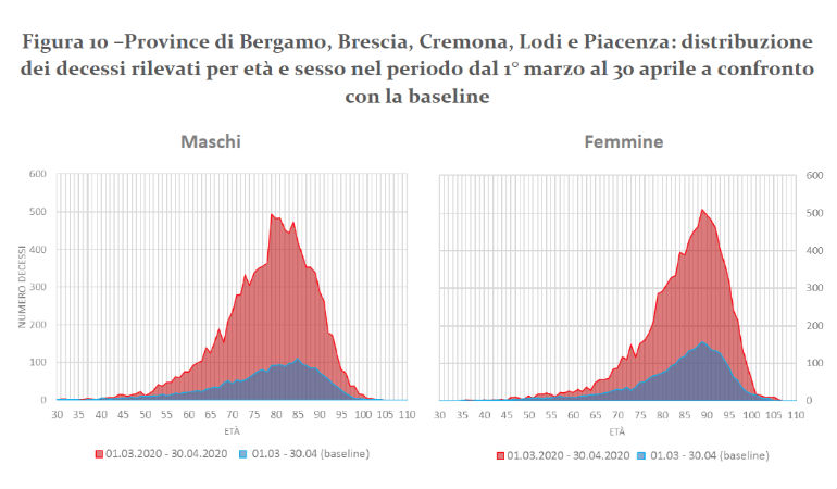 L’attenzione dello studio si focalizza proprio su queste province: “Se analizziamo la distribuzione per età e sesso che deriva dalla differenza con la baseline si desume un’età media al decesso di 81,5 (78,5 anni per i maschi e 85,1 per le femmine). La percentuale di donne è risultata del 44,5% mentre nello stesso periodo riferito alla baseline risulta del 53,8%, a conferma che il virus colpisce maggiormente gli uomini.
