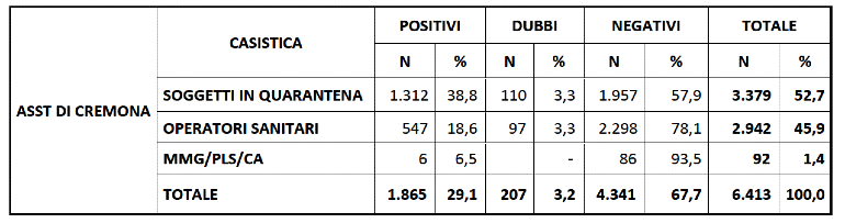 Si discostano di poco le percentuali dei test effettuati dall’Asst di Cremona: i cittadini in quarantena testati sono stati 3.379, con il 38,8% di positivi; i medici, i pediatri e medici di continuità assistenziale sono stati 92 con il 6,5% di positivi; gli operatori sanitari 2942 con il 18,6% di positivi. Prendendo tutte le categorie, il 29,1% dei test risulta positivo, il 3,2% dubbio, il 67,7% negativo.