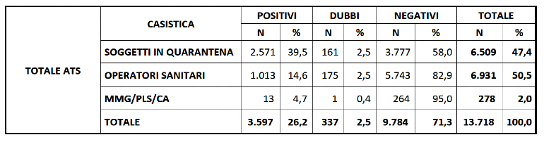 Tra gli operatori sanitari (6.931 test in tutto) si sono riscontrati 1.013 casi positivi (14,6%), 5.743 negativi (82,9%) e 175 dubbi (2,5%). Complessivamente tra tutte le categorie testate, il 26,2% risulta positivo.