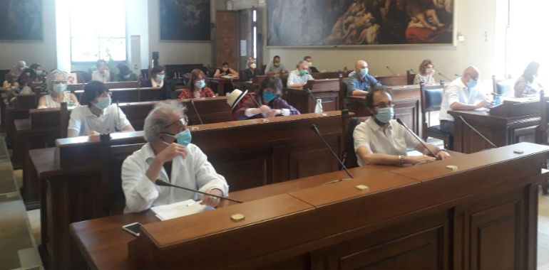 Primo consiglio comunale nell’era Covid nel Salone dei Quadri oggi pomeriggio. Per consentire il distanziamento è stato ridotto il numero dei banchi, con solo due consiglieri per ciascuno, a distanza di oltre un metro. 26 i consiglieri presenti; assenti ma collegati in videoconferenza, due consiglieri del Pd, Giovanni Gagliardi e Santo Canale; e quelli della Lega Arena, Burgazzi, Chiodelli e e Zagni. Al tavolo della Giunta siede solo il sindaco Gianluca Galimberti, insieme, inizialmente, all’assessore Barbara Manfredini. Gli altri assessori sono entrati di volta in volta a seconda degli argomenti da trattare.