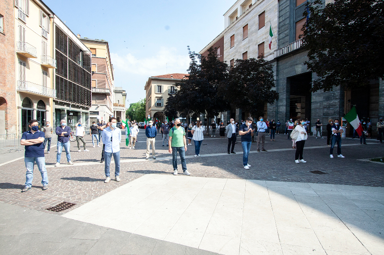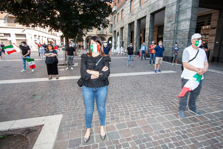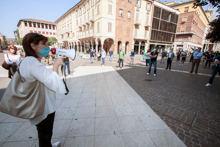 Anche Cremona ha visto la discesa in piazza del centrodestra, per il flash mob organizzato a livello nazionale da Lega, Fratelli d’Italia, Forza Italia. Una manifestazione voluta per rappresentare il malcontento di quella parte di italiani che non si sente tutelata dalle misure di sostegno varate dal Governo e vuole “rialzare la testa in un momento in cui il paese non vede una via d’uscita da quella che era una crisi sanitaria e che si è già tramutata e lo sarà sempre di più, in una crisi economica”, come spiega la consigliera comunale della lega Nord Simona Sommi. 60 -70 i simpatizzanti schierati nella parte ombreggiata della piazza tutti muniti di mascherina, chi tricolore, chi nera, chi neutra. Discreta la presenza delle forze dell’ordine, in borghese e non, per evitare eventuali disordini che erano nell’aria, dopo la comparsa delle scritte sulla sede della Lega in via Araldi Erizzo sabato scorso e dopo il lancio, domenica mattina in piazza del Comune, di decine di volantini con la scritta ‘sotto la mascherina i fascisti di sempre’.