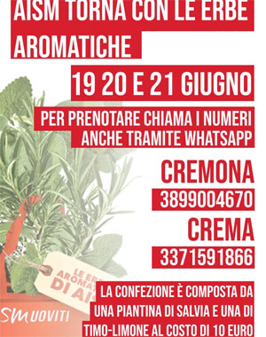 A causa della pandemia dovuto al Covid 19, quest’anno le Erbe aromatiche non si troveranno sui classici banchetti sparsi in Cremona e nella sua provincia, ma dovranno essere prenotate ai numeri indicati sulla foto qui a fianco e potranno essere ritirati dal 19 giugno, presso la sezione di Cremona via dell’Annona 1/3 a Cremona o alla sede del Gruppo Operativo cremasco Villa San Giuseppe via Priori 21 a Crema.