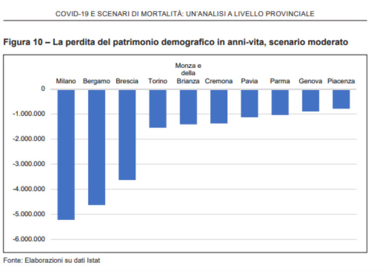 Per alcuni territori si torna indietro di circa 20 anni, come nel caso di Bergamo – dove la speranza di vita qui stimata equivale a quella accertata nel lontano anno 2000 – o di Cremona (dove si torna al 2003), mentre in molte altre Province, quasi tutte al Nord, il ritorno al passato, se anche non arriva ad approssimarsi a un ventennio, è comunque superiore a una decade”.