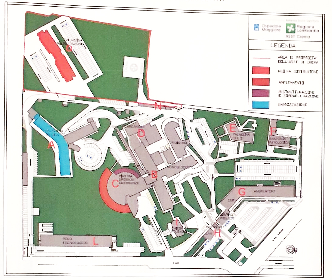 Palazzina Riabilitazione: si prevede la realizzazione di un nuovo edificio costituito da un piano interrato e tre piani fuori terra da destinare a riabilitazione respiratoria, neurologica e cardiologica con un numero complessivo di 60 posti letto. La superficie di ogni singolo piano è pari a circa 1000 metri quadrati, per una superficie complessiva di 4mila metri quadrati, il costo totale presunto è pari a 8.800.000 euro. Sistemazione esterna area di proprietà Asst e collegamenti: si prevede la realizzazione di parcheggi e aree a verde, nonché un cunicolo sotterraneo per il per il collegamento del nuovo edificio, per un costo previsto di 1.300.000 euro.
