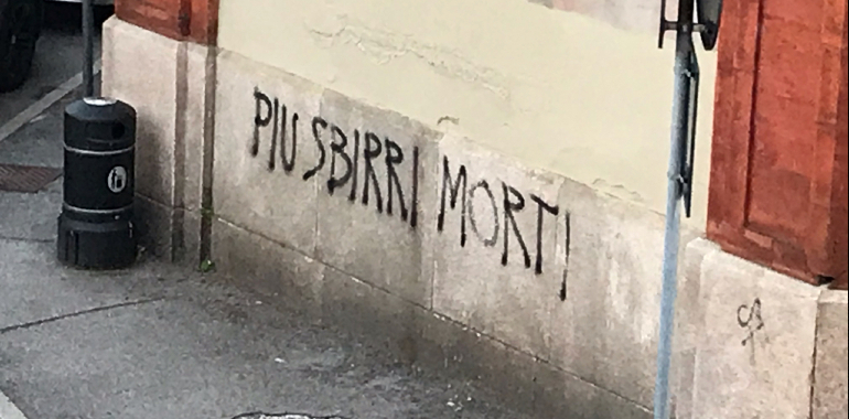 “Più sbirri morti”. E’ questa la scritta che campeggia, ormai da almeno tre anni, via XI febbraio, angolo via Realdo Colombo. Un lettore ha voltuo esprimere tutto il proprio disagio per la mancata cancellazione della stessa, un mancato intervento trovato “assurdo” dal residente. Anche perché, tale scritta, si trova sopra una scuola, davanti alla chiesa di Santa Maria Maddalena e vicino ad una sede degli Alpini. “Sembra che nessuno la veda e che rimanga lì indisturbata, sempre presente, senza che nessuno intervenga”, dice il cittadino che, con amarezza, aggiunge: “Una scuola dovrebbe essere il cuore dell’educazione civica, una Chiesa un luogo di preghiera: ci scandalizziamo per erbacce cresciute, ma nessuno parla di questo ‘scempio’ che sembra diventato una costante del nostro bel centro…”.