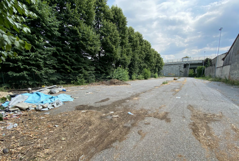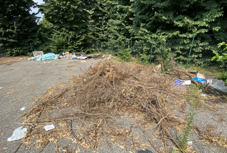 Lo scempio di questa zona seminascosta ma neanche tanto, segnalato da alcuni residenti di via Brescia, è tanto più evidente in quanto vi si accede dalla rotonda circondata da prato e alberi ben tenuti, il che rende il contrasto ancora più stridente. gb