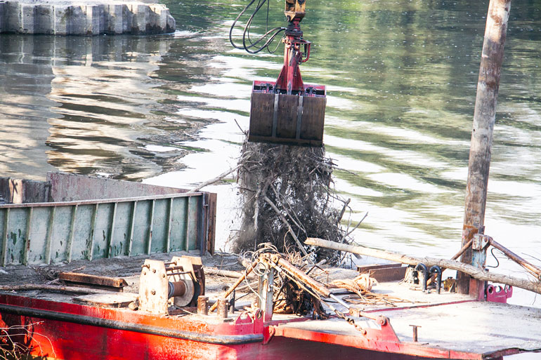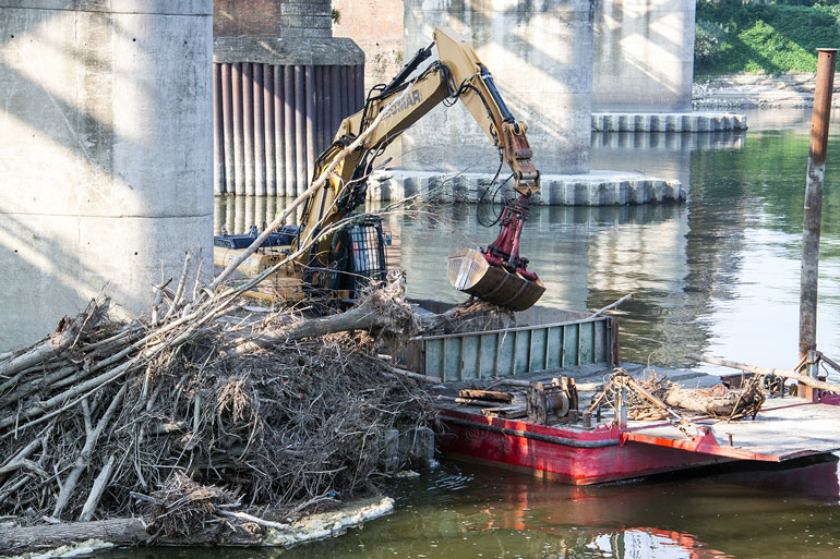 Una scena piuttosto sconcertante quella a cui hanno assistito diversi cittadini nei pressi del ponte di Po, la mattina di giovedì, quando un mucchio di tronchi e detriti è stato lasciato scivolare lungo il corso del fiume, dove ha rischiato di travolgere diverse barche ormeggiate. Una chiatta, su ordine di Rfi (Reti ferroviarie italiane), ha infatti rimosso i detriti che ormai da tempo si erano accumulati a ridosso dei piloni del ponte ferroviario.