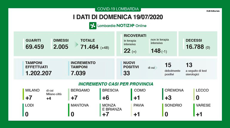 Guardando alle province del territorio regionale, tutti restano con crescite a una sola cifra: 7 a Milano Bergamo e Monza e Brianza, 6 a Brescia, 3 a Cremona, 1 a Como, Pavia, Varese, e 0 nuovi casi a Lecco, Lodi, Mantova e Sondrio.