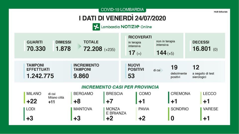 Un nuovo tampone positivi è stato registrato in tutta la provincia di Cremona su un totale regionale di 9860 tamponi effettuati. Nelle province limitrofe, nel milanese sono stati conteggiati 22 casi, di cui 11 a Milano città, Bergamo 8, Brescia 7, Como 1, Lecco 1, Lodi 3, Mantova 3, Monza e Brianza 2, Pavia 2, Sondrio 0, Varese 1. I nuovi casi positivi in tutta la Regione sono 53, di cui 19 debolmente positivi e 12 a seguito di test sierologici. Nessun decesso. Sempre in Regione il numero dei ricoverati in terapia intensiva è stabile a 17, mentre i ricoveri non in terapia intensiva salgono di cinque unità, attestandosi a 144.