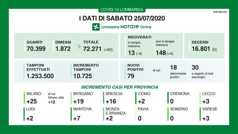 Sono 79 i nuovi casi positivi in regione (di cui 18 ‘debolmente positivi’ e 30 a seguito di test sierologici), mentre continuano a calare i malati in terapia intensiva, che scendono a 13 (-4). Aumentano invece i ricoverati in altri reparti, che salgono a 148 (+4). Nelle altre province chi registra l’incremento maggiore è Milano (+25), seguita da Bergamo (+19) e Brescia (+16).