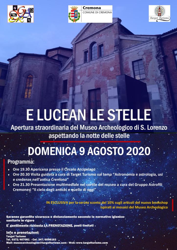 Il Comune di Cremona in collaborazione con Target Turismo e Gruppo Astrofili Cremonesi organizza per domenica 9 agosto una speciale apertura straordinaria in notturna del Museo Archeologico S. Lorenzo. Una serata dal titolo ‘E lucean le stelle’, una sorta di anteprima in attesa della notte di S. Lorenzo, santo a cui è intitolata tra l’altro l’antica e suggestiva basilica in cui il museo stesso è ospitato sin dalla sua apertura.