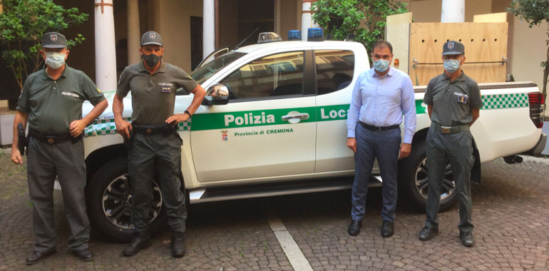 Alla presentazione del mezzo il presidente della Provincia di Cremona, Paolo Mirko Signoroni con il Comandante della Polizia Locale Provinciale Massimo Pegorini ed il Vice Marco Sperzaga insieme con l’agente Aldo Maffezzoni.