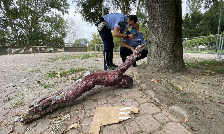 Nessun rispetto, dunque né per l’opera d’arte né per il simbolo religioso. Ad accorgersi del danneggiamento è stato Armando Catullo, da sempre impegnato nella tutela del Grande Fiume, che nelle settimane precedenti aveva sistemato l’area rimuovendo fango ed erbacce. Le transenne non sono servite a proteggere l’opera dalla scelleratezza di chi, durante la notte, ha scagliato le pietre del basamento contro la statua fino a farla precipitare e presumibilmente una volta a terra l’ha presa a calci, come lascia intuire il ritrovamento a diversi metri di distanza dal palo su cui era fissata. Nei dintorni sono stati abbandonati inoltre diversi rifiuti.