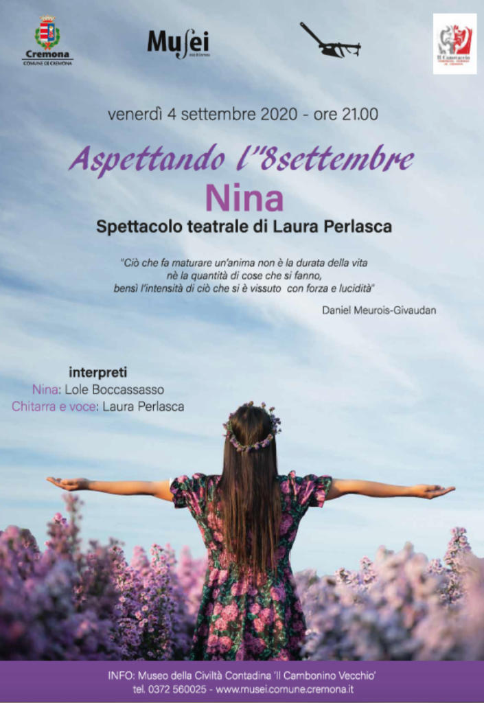 Nina è il titolo dello spettacolo promosso dalla compagnia teatrale Il Canovaccio che andrà in scena venerdì 4 settembre, alle ore 21.00, al Museo della Civilità Contadina “Il Cambonino Vecchio” (viale Cambonino, 22), in collaborazione con il Settore Cultura e Musei del Comune di Cremona. Testo, musiche e canzoni sono di Laura Perlasca, interpretti Lole Boccasasso (Nina) e la stessa Perlasca (chitarra e voce). L’ingresso è libero, con obbligo di mascherina e nel rispetto delle norme sul distanziamento.