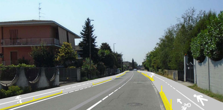 Si è optato per piste monodirezionali contrapposte in modo da garantire la continuità del percorso tra le aree edificate sia sul fronte est sia sul fronte ovest di via Boschetto tanto per i cicli quanto per i pedoni e, più in generale, il collegamento del quartiere con il resto della città attraverso la pista ciclabile esistente lungo il tratto del sottopasso alla tangenziale e a sud della stessa. Lo schema individuato permette, tra l’altro, di evitare transiti ciclopedonali in carreggiata per carenza di spazi adeguati in banchina oltre ad attraversamenti della carreggiata.