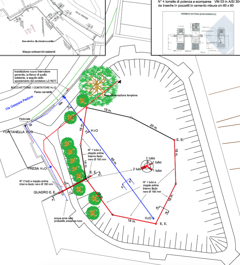 Dotazione energia elettrica. E’ prevista l’implementazione dei punti di distribuzione di energia elettrica (ora un solo punto) mediante la posa di 4 torrette a ribalta con relative prese lungo il perimetro dello spazio pianeggiante. Ci sarà un nuovo quadro elettrico e lo spostamento del contatore per una maggior sicurezza e rispondenza alle normative. La potenza dell’impianto potrà raggiungere i 90 Kw.